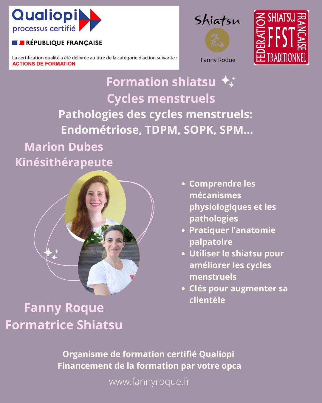 Passionnée par son métier elle décide d’intégrer l’équipe de formateurs de l’école de Shiatsu de Fanny Roque afin de transmettre ses connaissances et travailler en équipe pour une meilleure prise en charge globale de la femme.